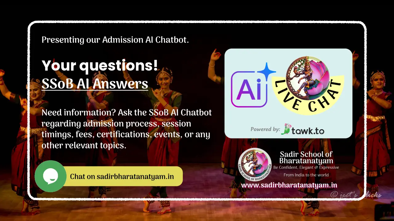 Sadir School of Bharatanatyam (SSoB), led by Mrs. Priya Chakroborty, a triple Gold Medalist and featured Bharatanatyam artist in New York Times Square, is an MSME/Udyam registered institution dedicated to Bharatanatyam training. Based in Pune, India, it offers in-person classes, while extending its reach globally through online mediums to students in the UK, USA, Canada, UAE, and Australia. Formerly recognized as "Bharatanatyam with Priya," SSoB was formally established in 2022. Catering to aspirants ranging from 6 years onwards and representing diverse genders and occupations, it currently boasts several inspiring mother-daughter duos among its enrolled students.